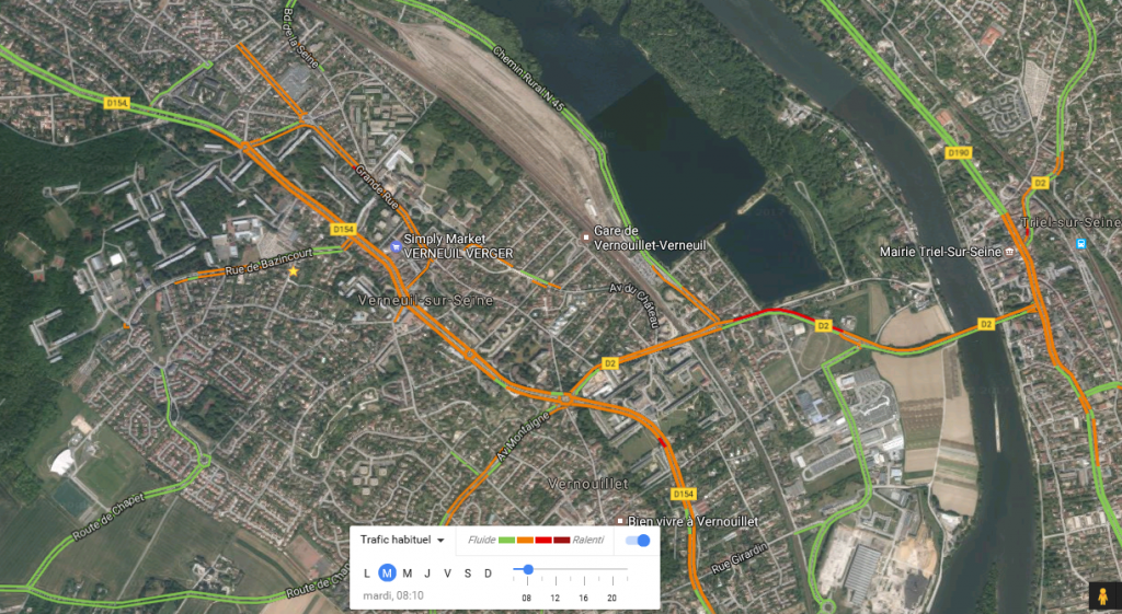 La vue ci-dessous montre le trafic attendu pour un mardi à 8 heures (la journée apparemment la plus chargée) : vous remarquez que les centres villes de Verneuil-sur-Seine et Vernouillet, mais aussi celui de Triel-sur-Seine connaissent un trafic qu’on peut qualifier de dense (couleur orange, soit le niveau 2 sur une échelle à 4 niveaux).