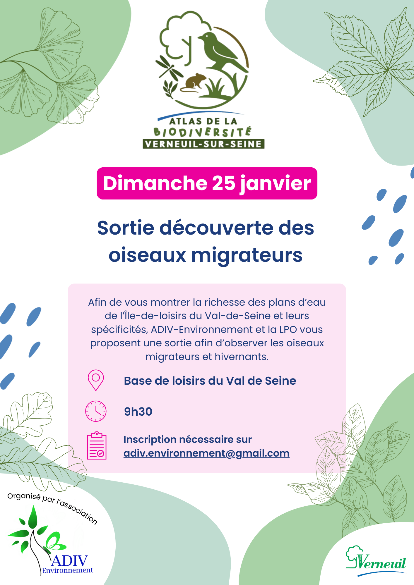 Cette sortie se déroulera le dimanche 25 janvier 2025 de 9h30 à 11h. Cette sortie est gratuite et ouverte à tous, adhérents ou non mais l’inscription à cette sortie est obligatoire et se fait par mail à l’adresse adiv.environnement@gmail.com en précisant le nombre de participants.